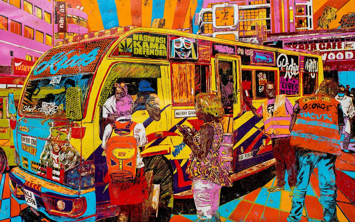 Muraguri’s technical process honours matatu artists as the image he constructs reflects every day life of those who come into contact with matatus. The visual density of Muraguri’s work does not give precedence to any one perspective and perhaps specifically because this image creates a sense of overwhelm. I read this as invitation to celebrate the quotidian. That is, everything that enables these routine gatherings of strangers; workers, students, men and women, and the conversations these matatus spark.